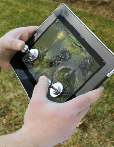 Cum adică, joystick pentru ecrane tactile? Mda… Adică, în loc să dai cu mînuța, folosești joystick-ul pe care-l fixezi pe ecran. Are o logică, pentru că astfel nu mai pari un copil care încearcă să nimerească niște simboluri colorate pe ecran, ci un adult care se joacă serios Pacman sau vreun joc cu împușcături.