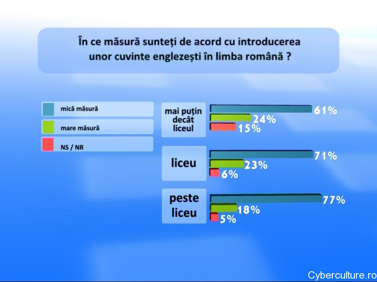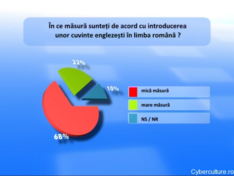Sondajul realizat de TVH 2.0 arată că mulți oameni cu studii peste liceu, dintre cei întrebați, nu sunt de acord cu introducerea unor cuvinte englezești în limba română. Vreo 68%, fără a-i diferenția pe studii, cred același lucru. Eu cred că românii care au răspuns sunt ipocriți.