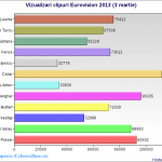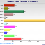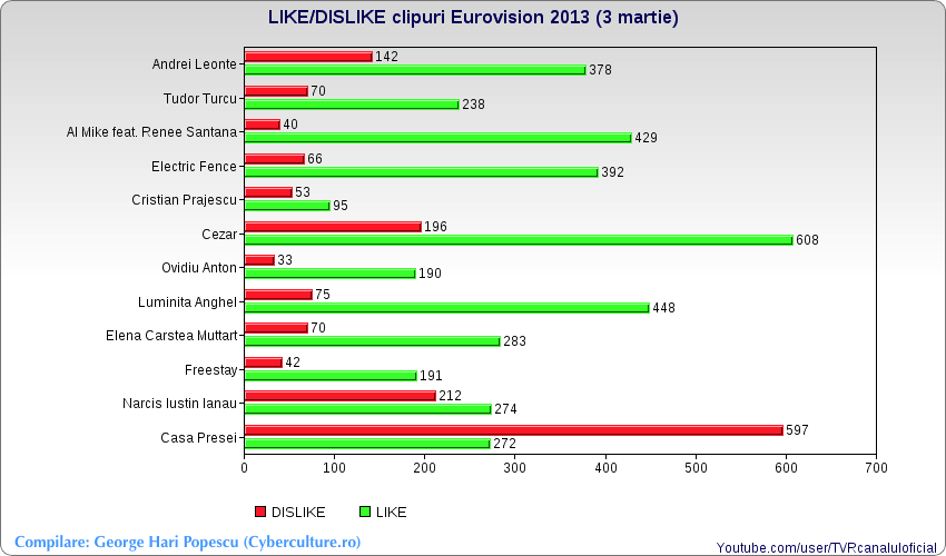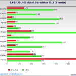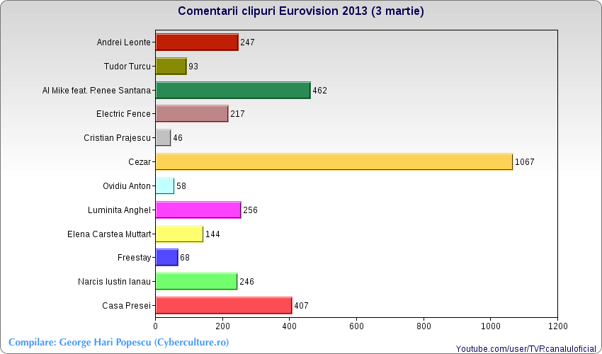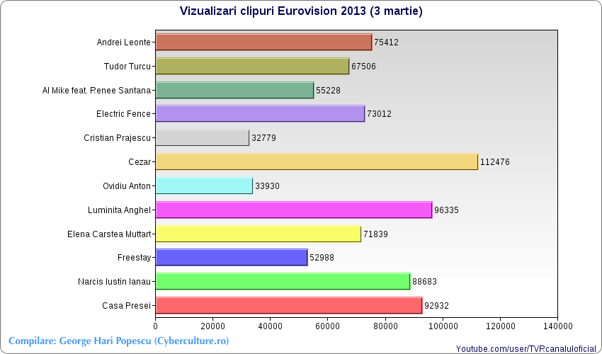 Între timp, m-am tot jucat cu cifrele publice de la canalul oficial de pe Youtube al TVR-ului și am generat aceste grafice, ca să vedeți cum stau concurenții online, la 5 zile înainte de finala națională.