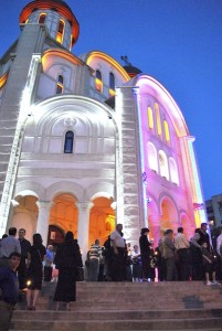 Terasa „cu cearceafuri” de lîngă Catedrala Sf. Sava era aproape plină. Totul, ca de obicei: muzică, grupuri mari, haine de gală croite din puțin material… Singura diferență a fost că s-a oprit curentul. Întunericul și liniștea bruscă m-au făcut să cred că a fost un gest intenționat, pentru că tocmai ieșea din catedrală procesiunea de înconjurare a bisericii. Dar nu, curentul a revenit după vreo 3 minute și muzica a pornit din nou.