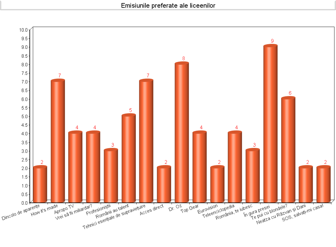 Nu inteleg, din moment ce ne-a fost dat sa prezentam/caracterizam o emisiune preferata, suntem criticati pe baza acestei alegeri. Ok, in privinta emisiunii „Te pui cu blondele?”, sunt de acord, dar nu inteleg de unde atata ironie la adresa unor emisiuni precum „Tehnici esentiale de supravietuire”. Am ajuns la concluzia ca niciuna dintre aceste doua emisiuni nu va place, deci ati luat problema strict personal. Dumnezeu sa va mai inteleaga! „Traim in Romania si asta ne ocupa tot timpul!”