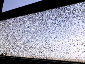 Lumea se vede mozaicată prin geamul de la vagonul 2 al chefereului spre Iași. Nu e o campanie, ci geamul securizat s-a făcut țăndări de la vreo lovitură și stă să cadă. Geamul mic de deasupra e deschis, ca să compenseze lipsa aerului condi.