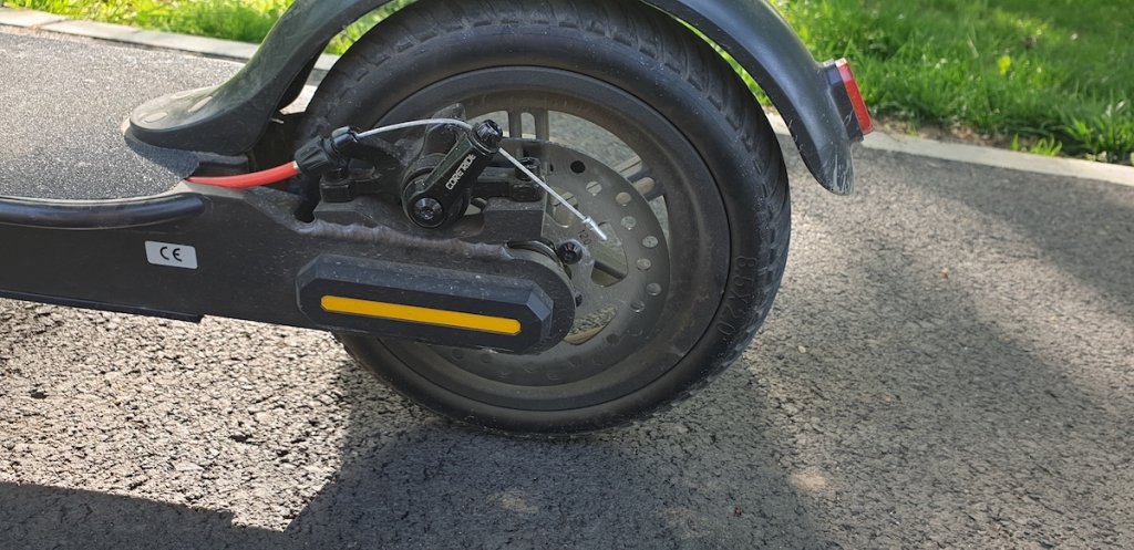 - în partea stîngă a ghidonului, e frîna; este sistem pe disc, dar nu hidraulică, însă tot trebuie să apeși treptat și încet la început; cînd apeși pe frînă și e lumina aprinsă, LED-ul roșu din spate clipește ușor, ca să-i atenționeze pe cei din urma ta;