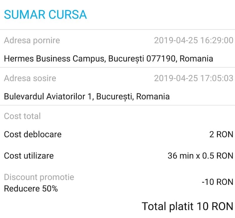 - Costă 2 lei pornirea (deblocarea) și 0,50 lei/minut, deci este bună pentru distanțe foarte mici, eventual pe unde nu e metrou. De la 5 km parcurși încolo, e mai rentabil taxiul. Vezi că, în primele 7 zile de utilizare a aplicației, tariful e la jumate, profită!