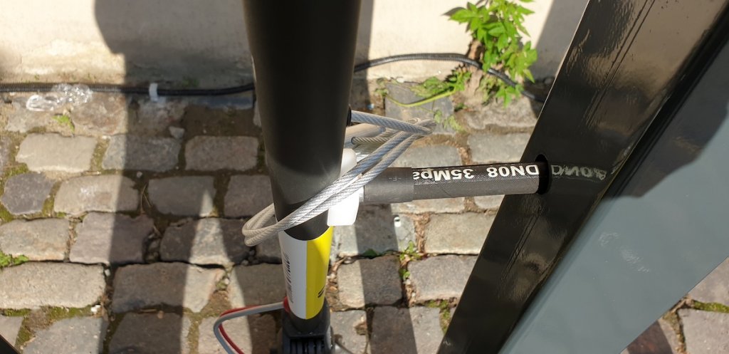 Ăsta este specificul lui Flow: trotinetele pot fi lăsate în parcările proprii (caz în care primești 2 lei) sau oriunde în aria de acoperire, cu condiția să le legi de ceva cu șufa încorporată și să faci o poză de confirmare.