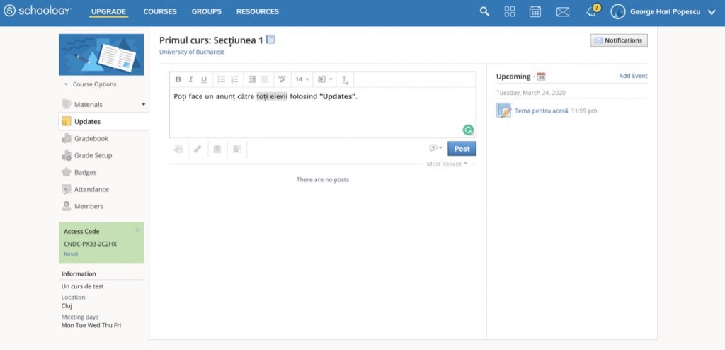 Eu le-am testat pe primele două. După ce ai creat contul de profesor, poți trece la conceperea cursului tău. Poți adăuga mai mulți co-profesori la cursul tău, iar pentru asta acele persoane trebuie să aibă un cont la Schoology. Apoi le oferi codul de acces la curs, ei ți se vor alătura și, din interfața de administrator, îi faci co-instructori.