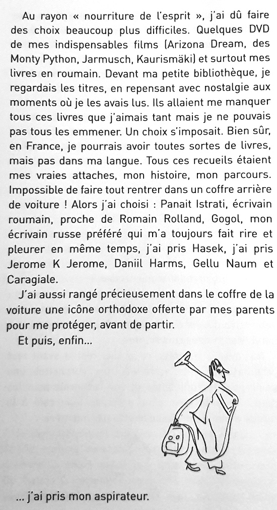 „În secțiunea «hrană pentru spirit», a trebuit să fac alegeri mult mai dificile. Câteva DVD-uri ale filmelor mele esențiale (Arizona Dream, Monty Python, Jarmusch, Kaurismäki) și mai ales cărțile mele în limba română. În fața micii mele biblioteci, m-am uitat la titluri, gândindu-mă cu nostalgie la vremurile în care le citisem. Avea să-mi fie dor de toate acele cărți pe care le iubeam atât de mult, dar nu le puteam lua pe toate. Trebuia făcută o alegere. Desigur, în Franța aș putea avea tot felul de cărți, dar nu în limba mea. Toate aceste colecții au fost legăturile mele reale, povestea mea, călătoria mea. Imposibil să îngrămădești totul într-un portbagaj de mașină! Așa că am ales: Panait Istrati, scriitor român, apropiat de Romain Rolland, Gogol, scriitorul meu preferat rus care m-a făcut mereu să râd și să plâng în același timp, am luat Hasek, am luat Jerome K. Jerome, Daniil Harms, Gellu Naum și Caragiale. De asemenea, am depozitat cu atenție în portbagajul mașinii o icoană ortodoxă oferită de părinți pentru a mă proteja, înainte de a pleca.