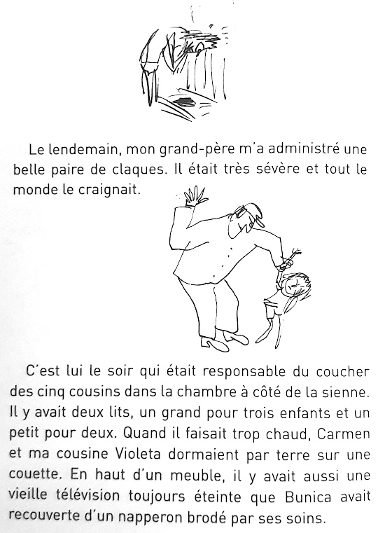 „A doua zi, bunicul meu mi-a administrat o frumoasă pereche de palme. Era foarte sever și toată lumea se temea de el. El era responsabil seara cu culcatul celor cinci veri în camera de lângă cea a lui. Erau acolo două paturi, unul mare pentru trei copii și unul mic pentru doi copii. Când era prea cald, Carmen și verișoara mea, Violeta, dormeau pe jos pe o pătură. Pe o mobilă, era un televizor vechi mereu închis pe care Bunica îl acoperise cu o dantelă făcută de ea”.